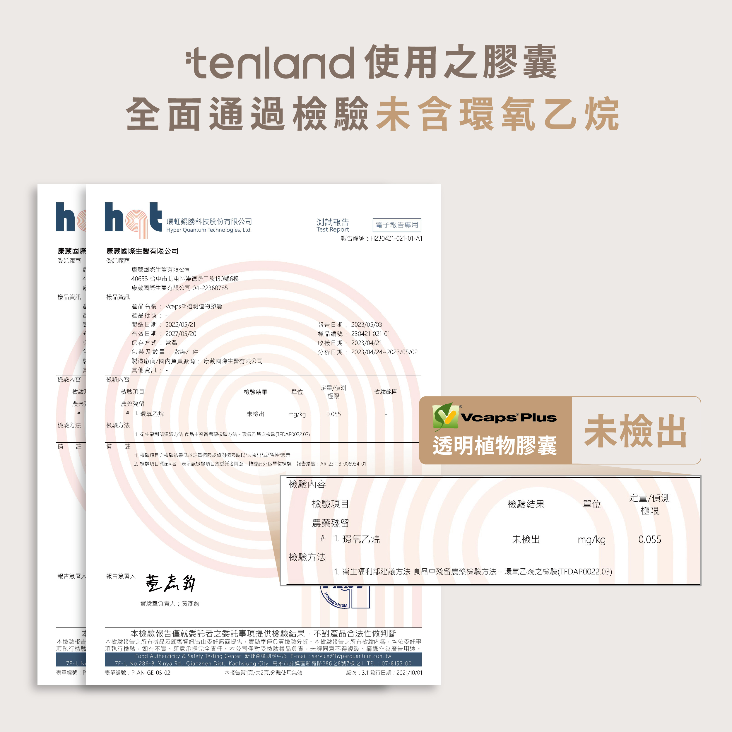 tenland將產品送至國家認證 HQT第三方公正檢驗機構進行試驗, 確認西藥、重金屬、微生物、塑化劑、農藥等最高658項檢驗測試合格, 以資訊透明化的方式公開檢視;用檢驗數據來證實食品安全。