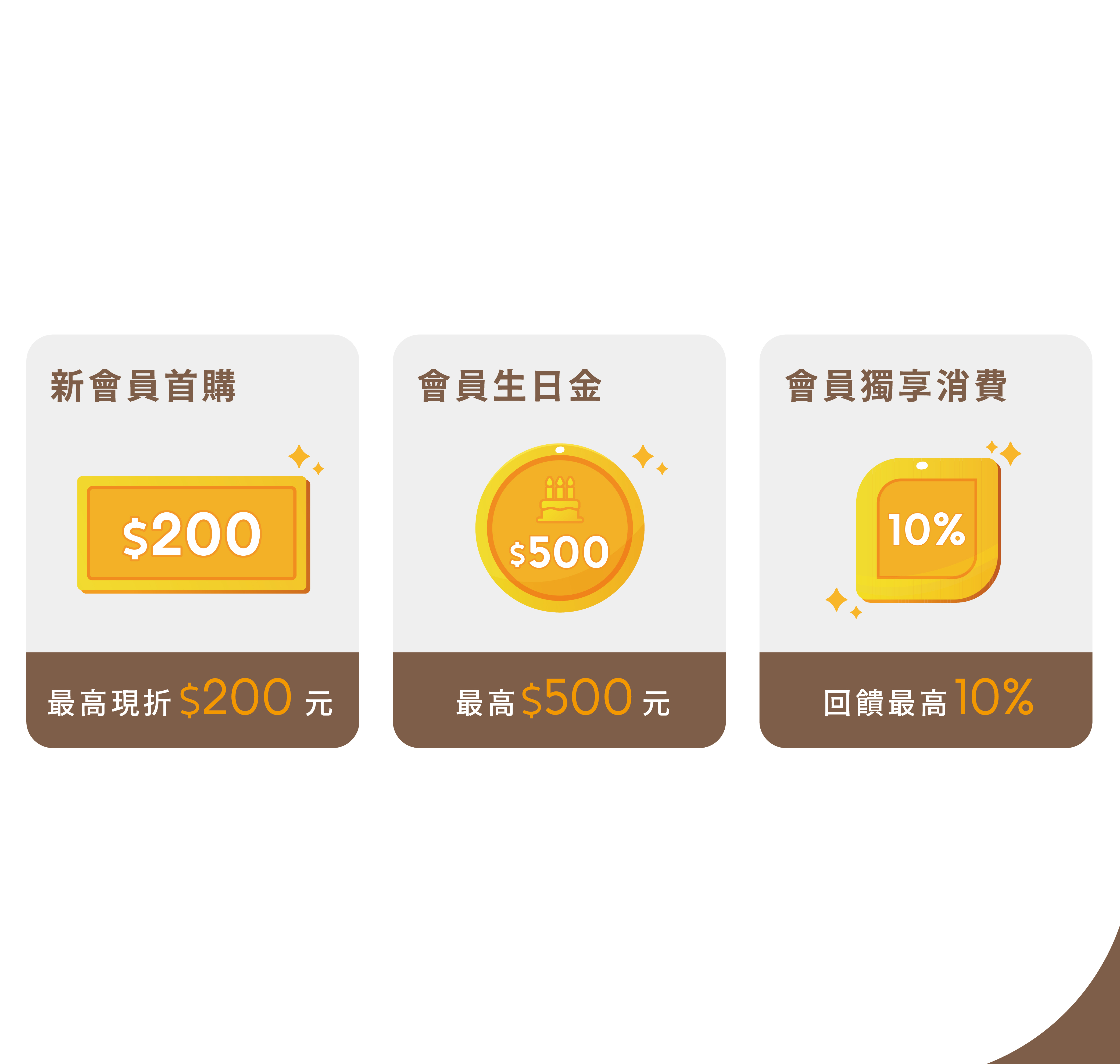 註冊即可獲得 100 元購物金(使用期限 30 天),生日當月 1 號發送 50 元生日禮金(使用期限 30 天)