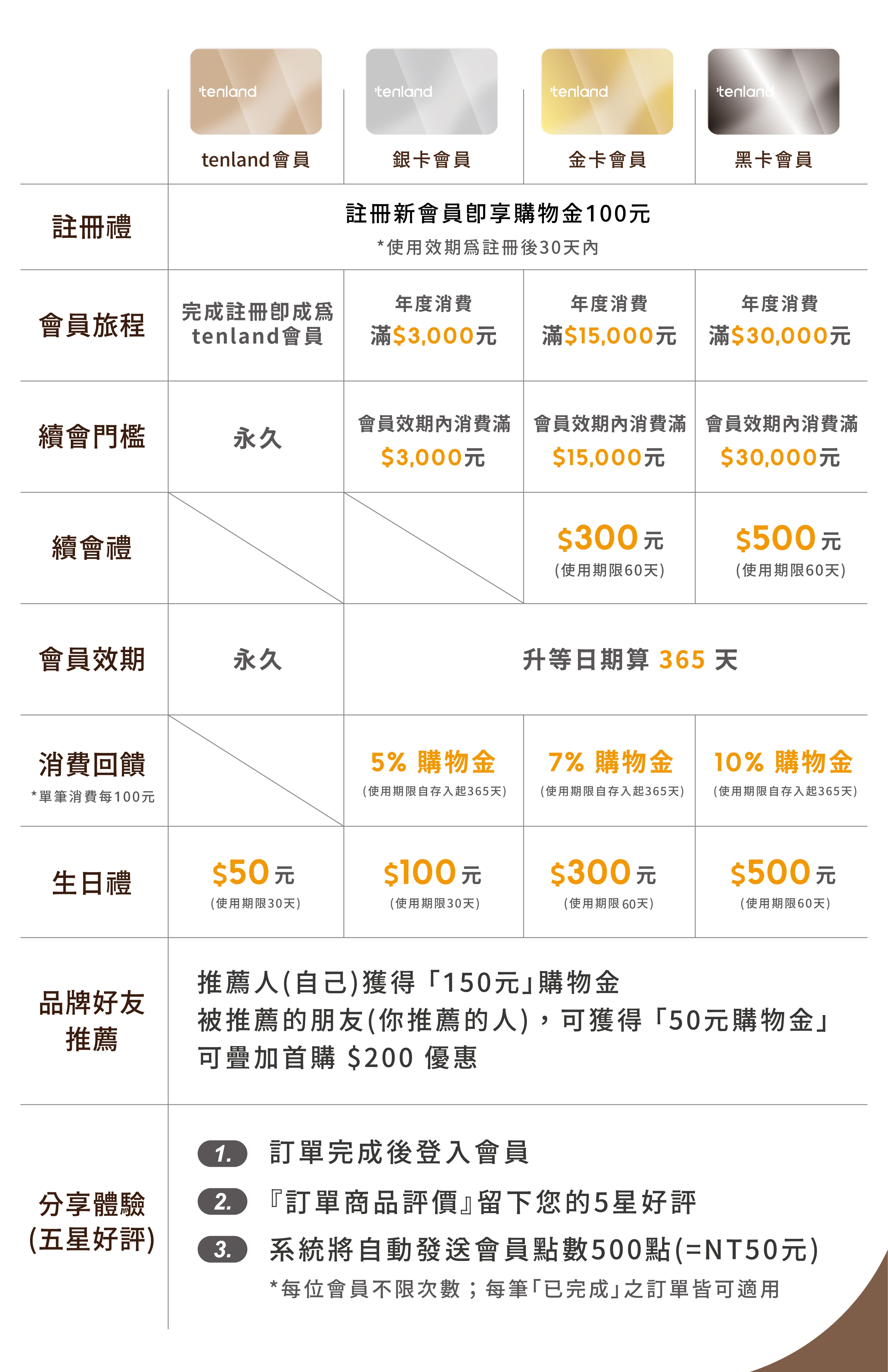 1.購物金回饋:為了讓每位會員在日常補充中能獲得更實際且彈性的回饋,tenland® 以「訂單完成後回饋」的方式累積購物金,並依會員等級提供不同回饋比例。適用:銀卡、金卡與黑卡會員所獲得的購物金,皆從每次存入的當日開始計算,擁有獨立的 365 天效期,讓你能依照個人的補充節奏,自由安排使用。