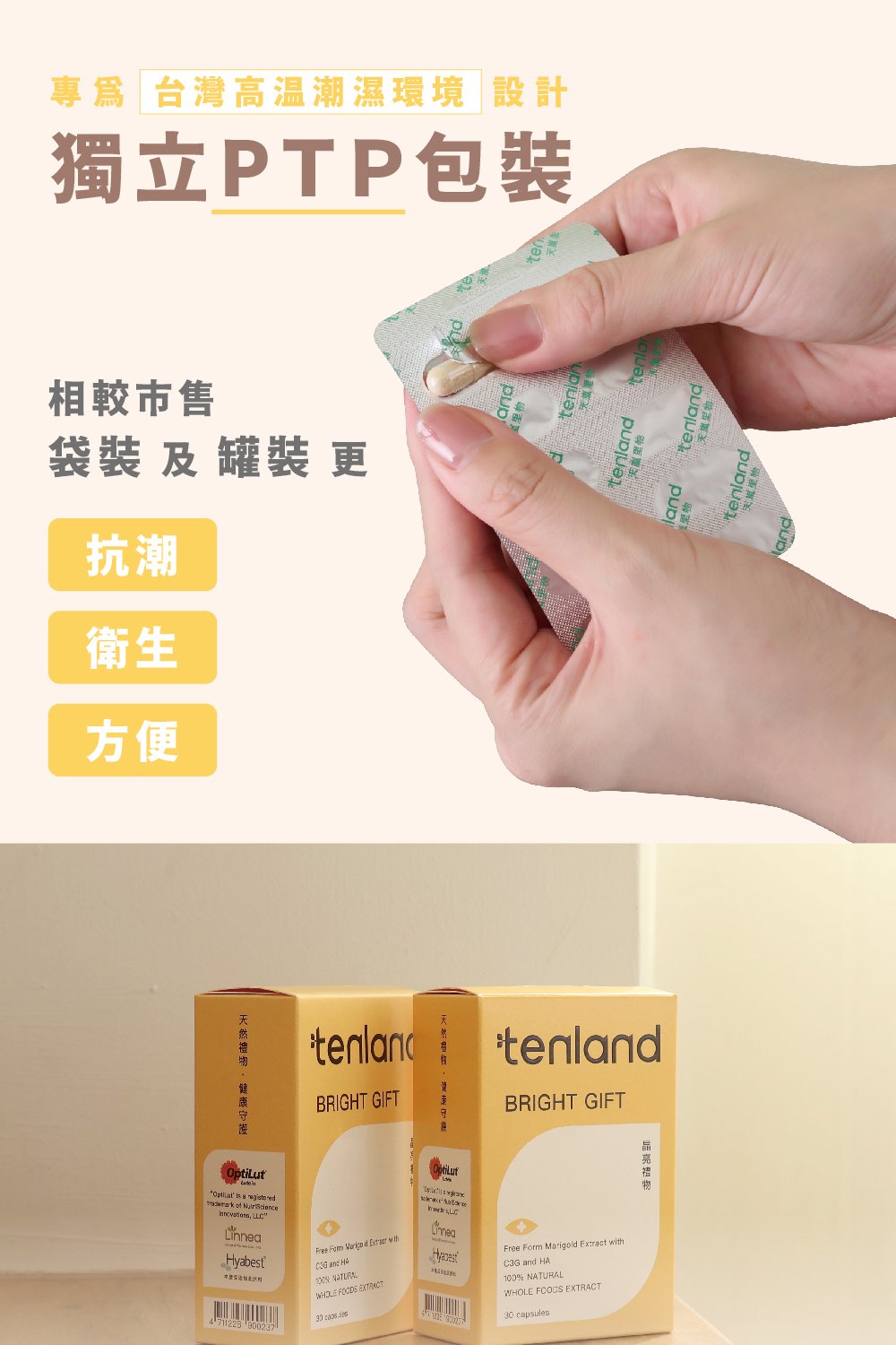 ➤ 因為台灣氣候高温潮濕,袋裝及瓶裝的保健品保存上有很大疑慮,每天開開關關拿取的過程,很難避免保健品受潮變質,建議選擇PTP獨立包裝型式的保健品,更安全衛生。