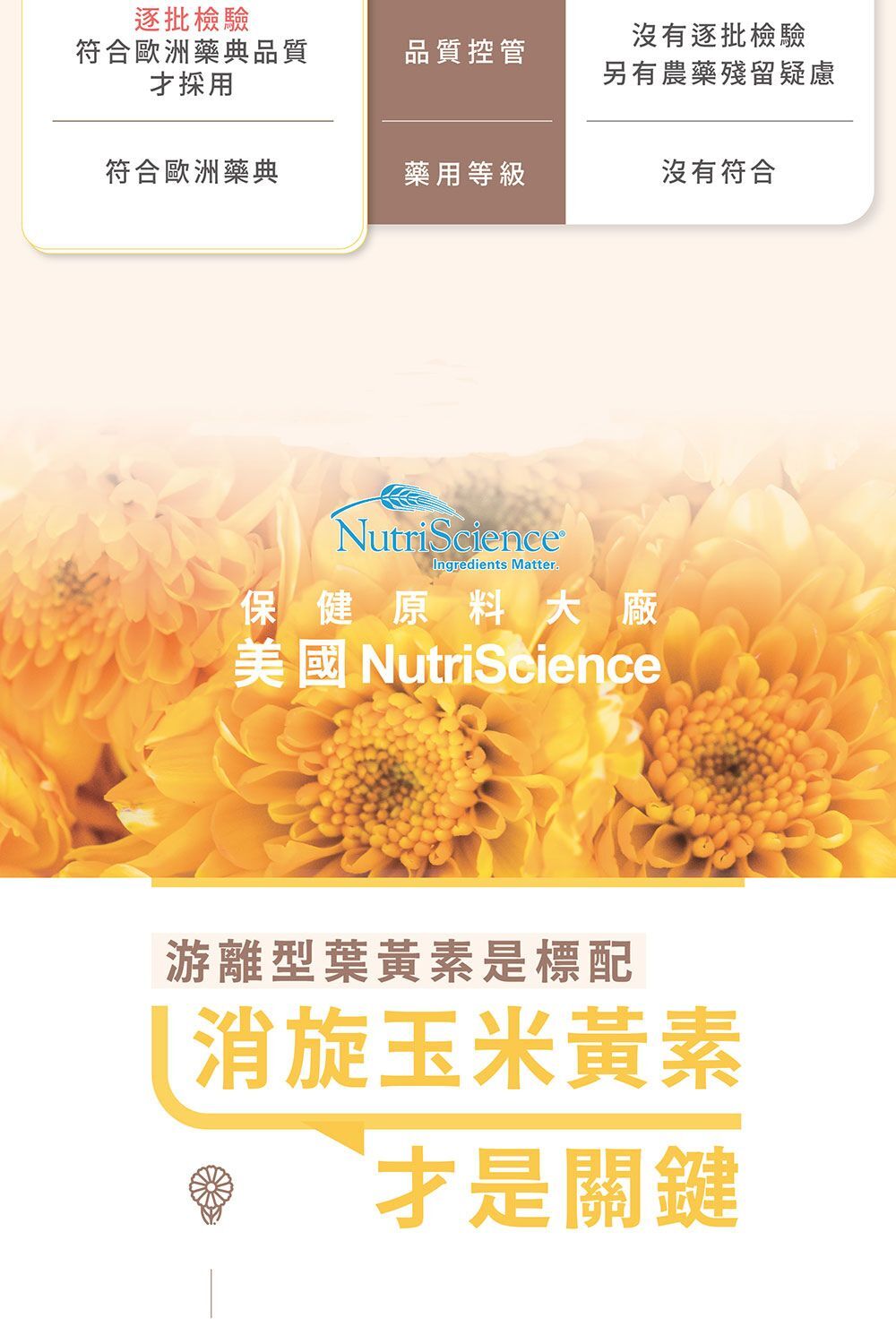 願意長久經營、在意品質的廠商才會願意花費時間與精力申請品牌,這點至少可以刷掉許多來源不明的粗製原料,且由於葉黃素屬於脂溶性營養素,是無法以水作為萃取溶劑的營養素,使用危害大的有機萃取溶劑原料對健康是有害的。