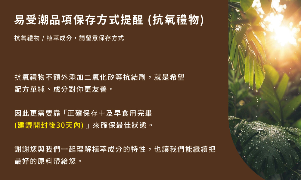 保存方法:請置於陰涼乾燥處,避免日光直照或高溫潮濕的環境。開封後請於30天內食用完畢,以保最佳效果。